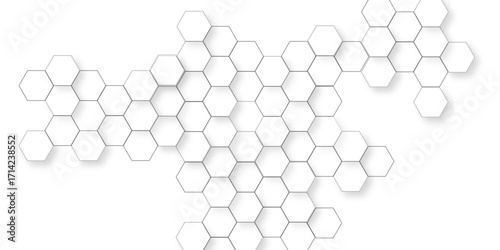Minimalist hexagon display with round platform white hexagon pattern background, honeycomb white mosaic cell web light and shadow texture design, elegant pattern of modern hexagon tiles.