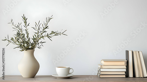 Minimalist Home Decor With Plant In Vase Coffee Cup And Stack Of Books On Wooden Table Against White Wall Background