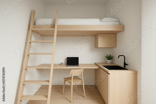 minimalist home for digital nomad. Compact modern studio features a loft bed, wooden desk with laptop, chair, kitchenette, and minimal decor in a neutral, bright space.