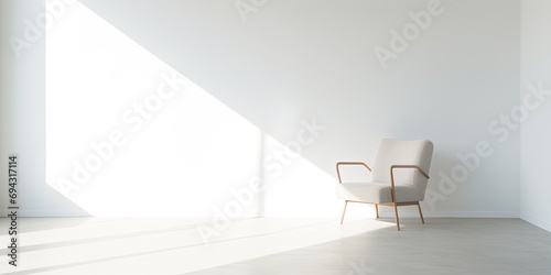 Minimalist horizontal photography depicting loneliness with a single chair in a white space, shaded by sunlight.