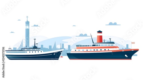 Minimalist icons depicting a sailboat speedboat and ferry against a clean white background representing various modes of water transportation and nautical travel