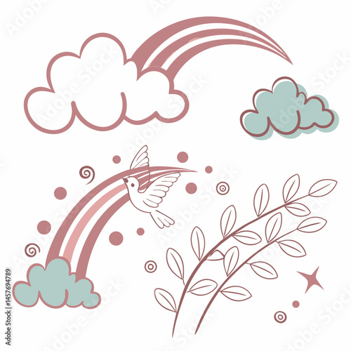 Minimalist Illustration Of Clouds Rainbow Dove And Leafy Branch Elements