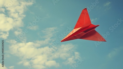 Minimalist image of a red paper airplane in mid-flight under sunny skies
