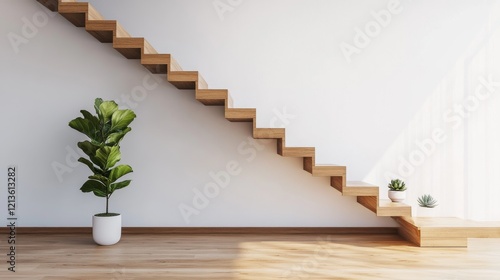 Minimalist interior space, floating wooden staircase mounted on white wall, light wooden flooring, fiddle leaf fig plant in white ceramic pot, small succulent plant, clean aesthetic, natural