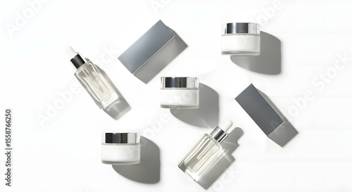 Minimalist layout featuring cosmetic cream jars, bottles, and boxes on a bright white surface.