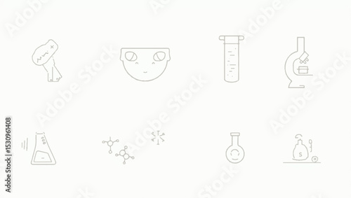 Minimalist line icon set in light grey depicting lab tools and science elements such as beakers, microscope, test tubes, lab mice, stomach, and molecule structures on a white background.