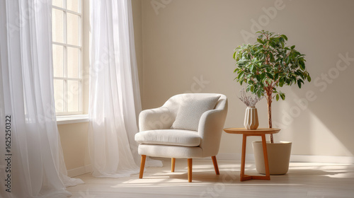 Minimalist living room featuring cozy armchair, small side table, and decorative plant. Soft natural light filters through sheer white curtains, creating serene atmosphere