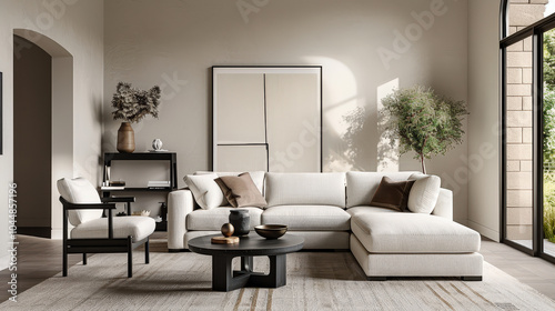 minimalist living room featuring pastel sofa, stylish coffee table, and elegant decor. space is bright and inviting, with natural light enhancing serene atmosphere
