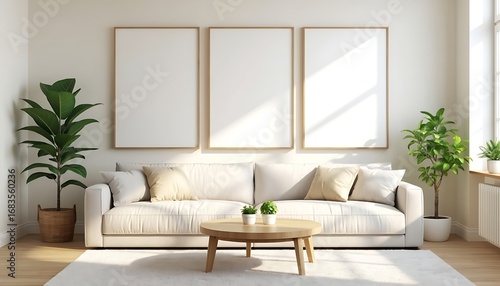 Minimalist Living Room Interior with Beige Sofa, Wooden Coffee Table, and Three Blank Frame Mockups under Natural Sunlight