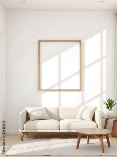 minimalist living room interior with bright airy design, white wall, wooden frame mockup, beige sofa, round coffee table, soft peaceful lighting, modern aesthetic