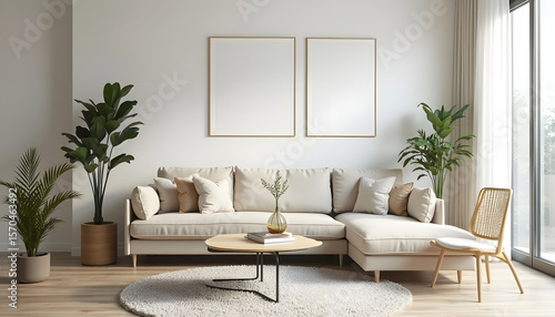Minimalist living room with a neutral palette and two empty frames. Represents home decor, interior design, or contemporary living. Clean and elegant.