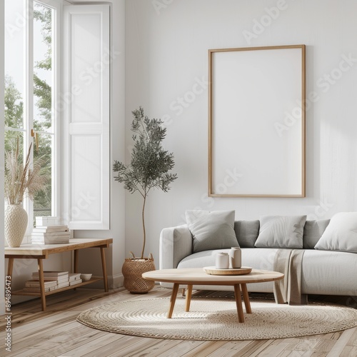 Minimalist Living Room with White Sofa, Wooden Coffee Table and Blank Frame Mockup