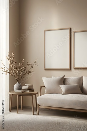 Minimalist Living Room with Wooden Frames and Natural Accents