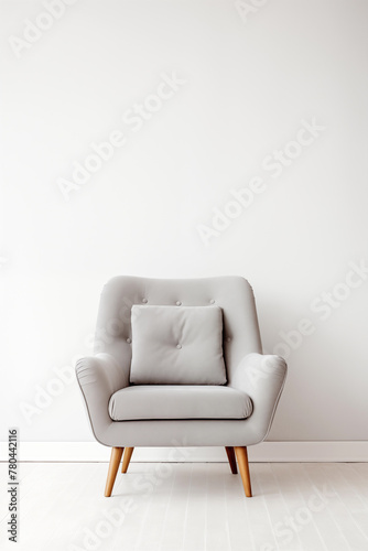 Minimalist modern interior with a stylish grey armchair against a clean white wall, perfect for home decor and design concepts.