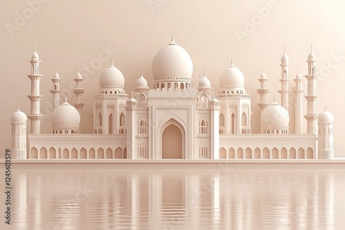 Minimalist mosque architecture reflected in water.