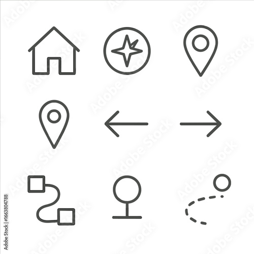 Minimalist Navigation Icons. Line style icons of minimalist navigation: simple home, flat compass, basic map pin, thin location