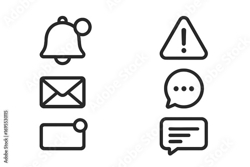 Minimalist notification icon set for modern UI. Vector line art symbols for web and app interfaces. Communication, alert, message, chat, and new email signs. Simple design.