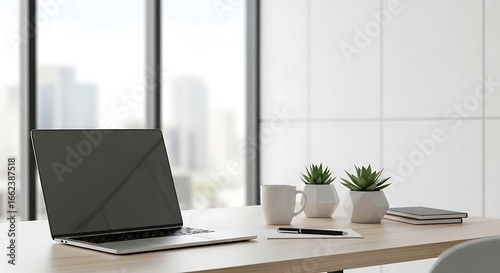 Minimalist Office Desk Setup with Laptop, Succulents, and City View
