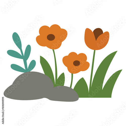 Minimalist orange poppy flowers with green leaves and stones, perfect for decorative outdoor garden plant arrangements.