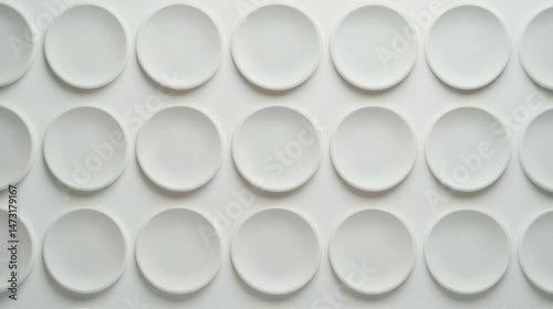 Minimalist pattern of evenly spaced, white circular plates arranged in a geometric grid on a light background.