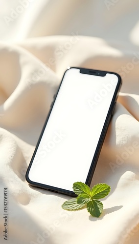 Minimalist phone mockup with clean black frame and white screen placed on a soft beige linen cloth with a sprig of fresh mint and shadows, symbolizing calm, mindfulness, and digital wellness.