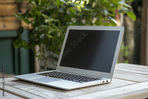 Minimalist photo of a closed laptop placed outdoors on a wooden surface, combining technology with nature and fresh workspace vibes.