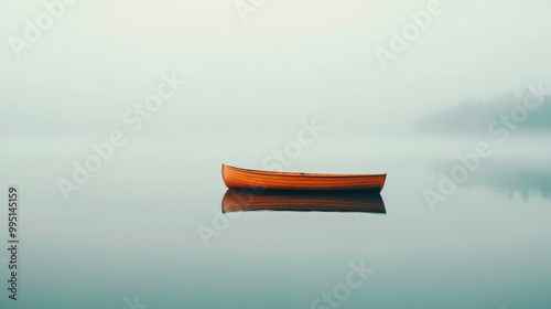 Minimalist photograph of a single wooden boat floating on still water with a soft foggy horizon in the distance creating calm serenity