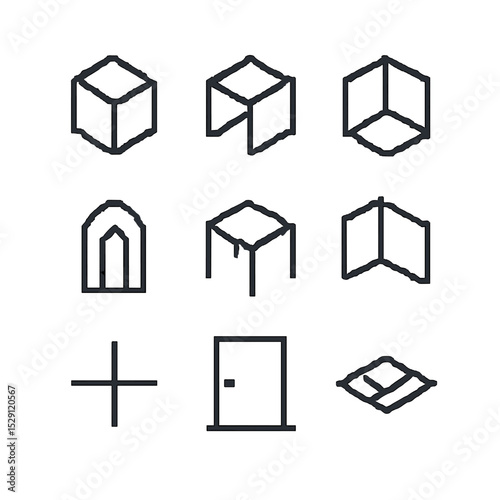 Minimalist Pixel Icons. Pixel art icon set of minimalist design elements: clean lines, open volume, monochrome palette, simple