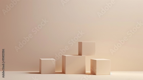 Minimalist product display with four beige square podiums on a soft beige background. Perfect for showcasing products.
