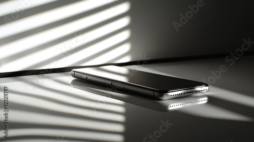 Minimalist product photography setup with a sleek smartphone on a reflective surface, soft lighting highlighting the device's contours and premium finish, emphasizing modern design and elegance.