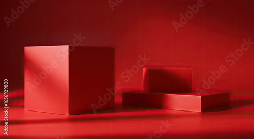 Minimalist Red Geometric Composition: Cubes, Shadows, and Dramatic Lighting.