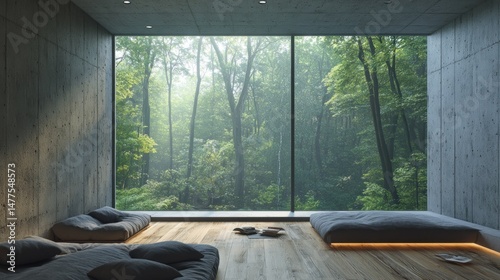 Minimalist room with large window overlooking lush forest; serene, tranquil atmosphere.