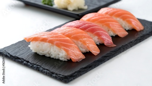 Minimalist salmon sushi arrangement on slate plate JPG. AI GENERATED.