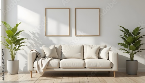 Minimalist Scandinavian Living Room – Light-Filled Modern Space with Sleek Sofa, Potted Plants, and Neutral Decor