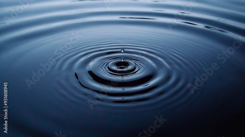 Minimalist scene of a clean water drop creating expanding circles on a dark blue still surface of the lake