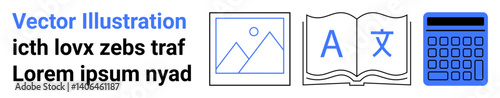 Minimalist set of icons including image frame, open book with language symbols, and calculator. Ideal for education, language learning, digital tools, math, research, school simple landing page