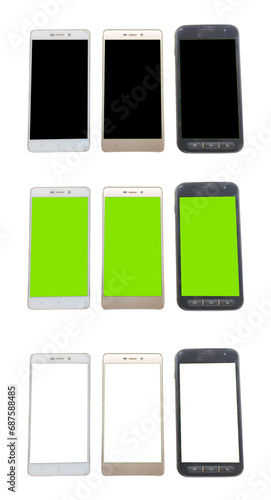 Minimalist smartphone collection in black, green, and white. A modern tech concept showcasing sleek designs and color variations, perfect for digital and electronics-themed projects.