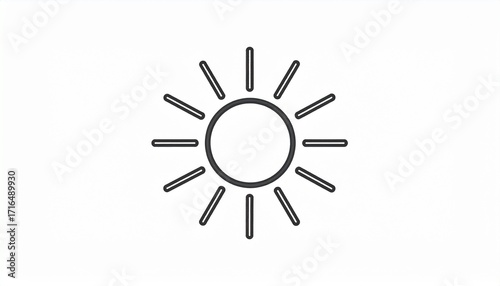 Minimalist sun icon with radiating rays, symbolizing brightness, warmth, summer, weather, and light. Simple line art graphic.