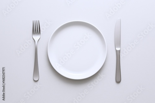 Minimalist Table Setting Featuring Empty White Plate, Fork, and Knife on Neutral Background for Dining Concepts
