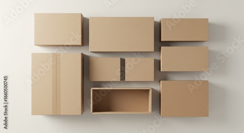 Minimalist Top-Down View of Neatly Arranged Cardboard Boxes, One Open and Empty.