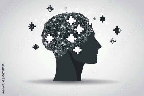Minimalist vector illustration of a human head filled with small puzzle pieces symbolizing complexity of thought the intricacies of identity and process of self discovery in simple elegant design