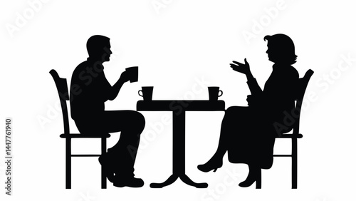 "Minimalist vector illustration of two people having a conversation at a café table, black and white silhouette, casual posture, coffee cups in hand, clean background, profile view, gesturing hands, i
