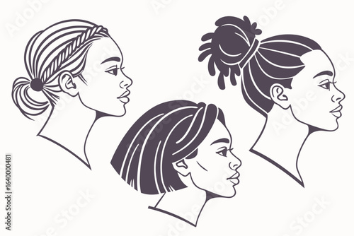 Minimalist Vector Silhouettes of Women’s Heads with Modern Hairstyles – High Ponytail, Layered Bob, Dreadlocks for UI and Digital Design