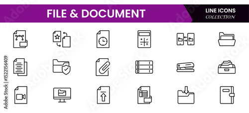 Minimalist vector web line icons representing file management, documents, organization, digital storage, and efficient data handling processes.