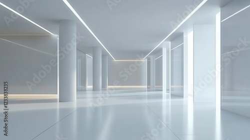 Minimalist white architectural interior featuring sleek columns and bright, evenly distributed lighting.