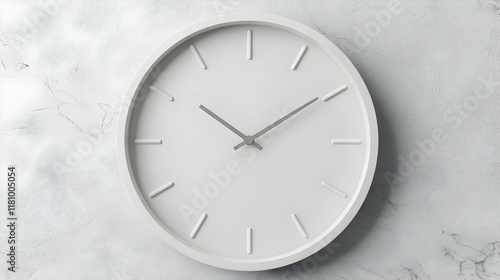 Minimalist white clock on marble background; time management concept.