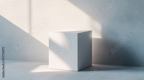 Minimalist white cube in sunlit room with subtle shadows, mockup of a box with a blank space
