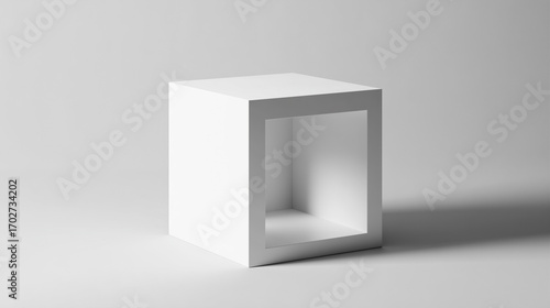 Minimalist white cube with hollow center on gray background.
