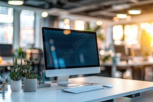 Minimalist white desk with a computer and office background, blurred business center interior in the blurred background. Mockup for design or presentation