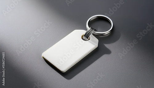 minimalist white keychain with blank rectangular tag on a gray surface under soft lighting